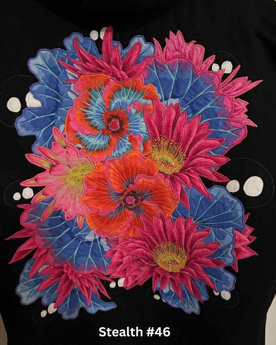 Stealth #34 - Peony and Hibiscus study in pinks on navy zip up.